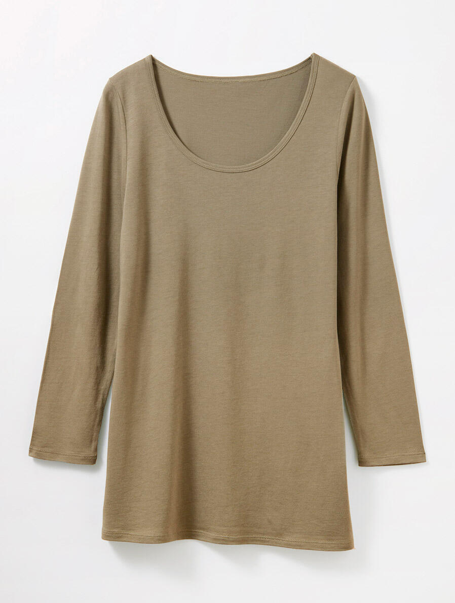 ◆ 胸元は、アウターに響かないすっきりしたカーブのデザイン。腰どまりのちょうど良い丈感で、ほどよくボディラインに添います。すっきり、シンプル な8分袖インナーです。
