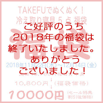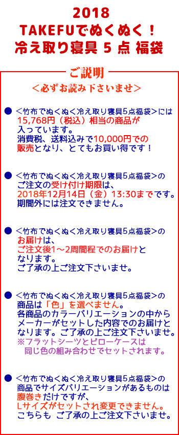 | 商 品 名 | 【TAKEFU】竹布2018年 ぬくぬく寝具 福袋(5点、税込15620円相当入り、カラーはお任せ。お届けまでに6-14日間掛かります。) |