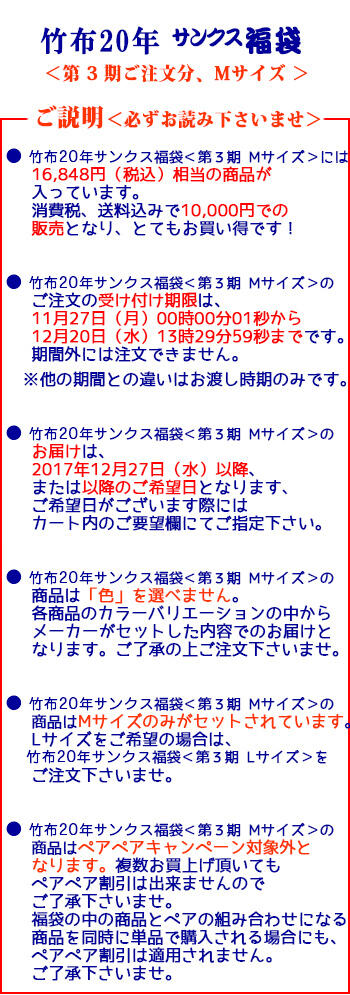 | 商 品 名 | 【期間限定】【第3期12/11-12/20受注】【TAKEFU】 竹布20年サンクス福袋<Mサイズ商品入り> |